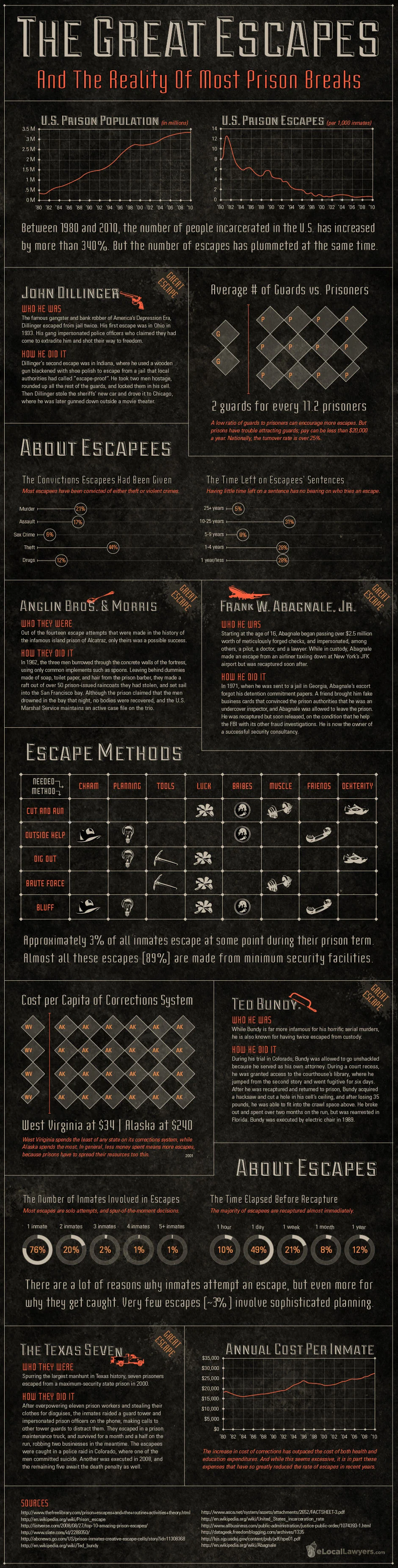 The most famous prison escapes have been by John Dillinger, Anglin Bros. and Morris, and Frank W. Abagnale.