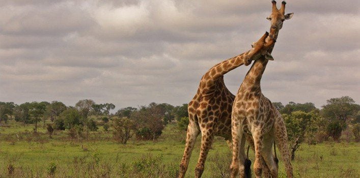 When giraffes are seen rubbing their necks against one another, they are competing to see who is stronger. Known as ‘necking’, it is a practice between male giraffes.